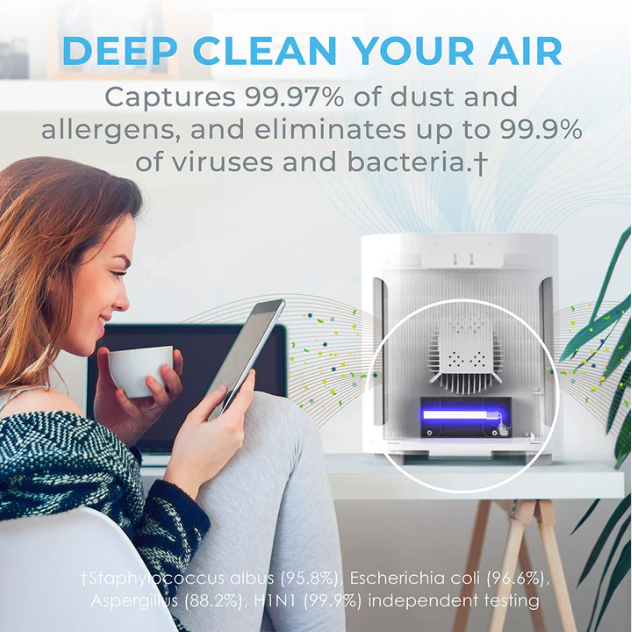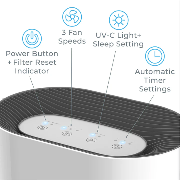 Breathe easier with the PureZone™ True HEPA Air Purifier & Replacement Filter Bundle. Its high-efficiency True HEPA filter and UV-C light work together to safely remove airborne particles as small as 0.3 microns, improving air quality in rooms up to 300 sq. ft. Designed for allergy and asthma support, it helps reduce pollutants from pets, spring allergies, and seasonal fires. The sleek design fits seamlessly into any home or office, making your space healthier and more comfortable.